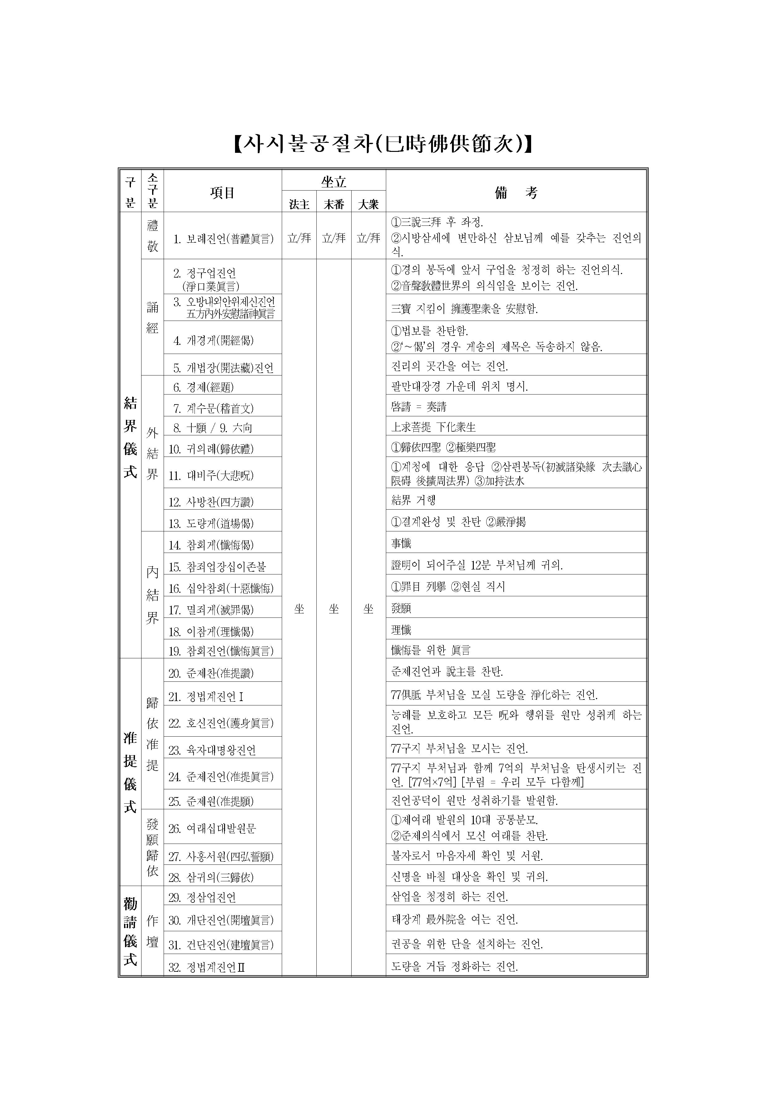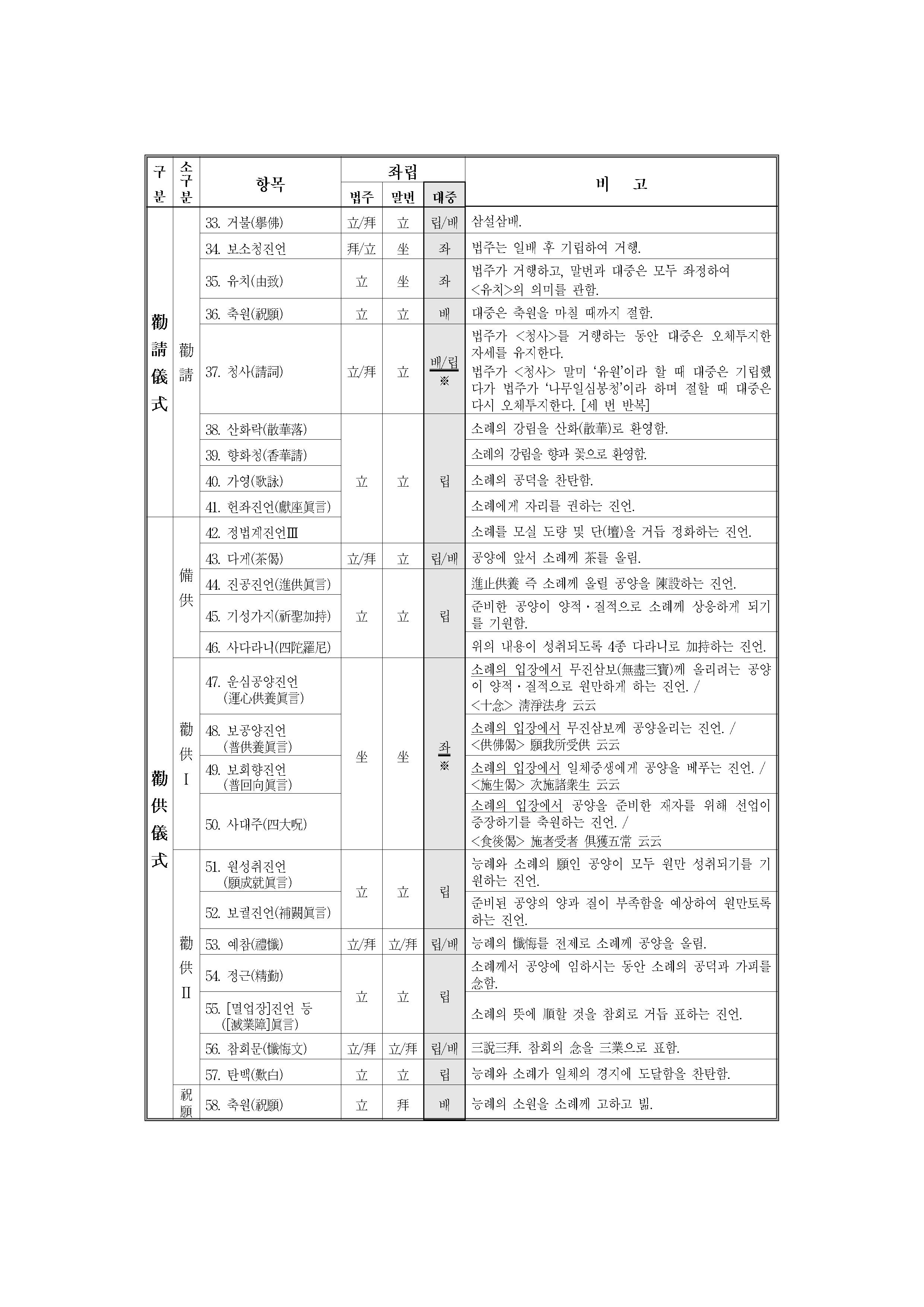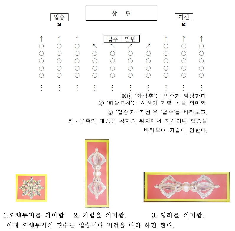여기서 언급하고자 하는 것은 ‘⑵좌립’에 관한 것이다. 의식집전에 있어서 시종 앉거나 서 있는 것이 아니라 각항의 내용이나 성격에 따라 앉기도 하고 서기도 하며, 때로는 오체투지를 하거나 행도(行道)를 한다.
